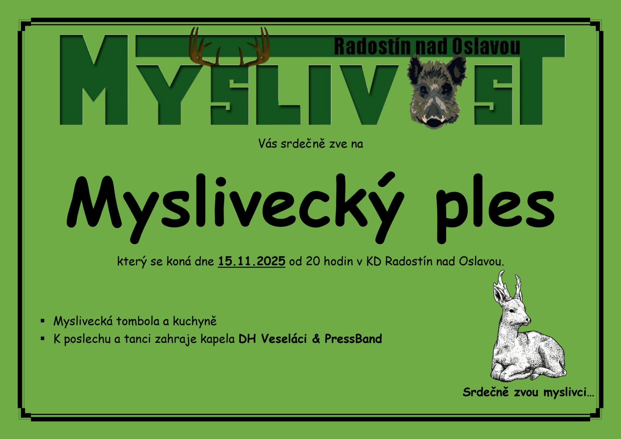 Myslivecký spolek v katastru Radostín nad Oslavou zve všechny občany na Myslivecký ples, který se uskuteční v sobotu 15. listopadu v kulturním domě.