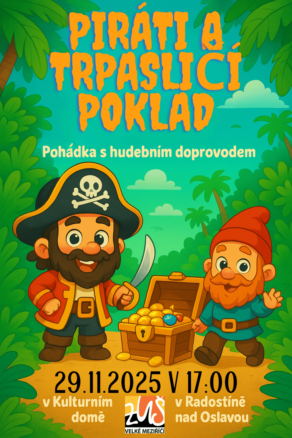 Žáci ze ZUŠ Velké Meziříčí Vás zvou na pohádku s hudebním doprovodem Piráti a trpasličí poklad. V sobotu 29. 11. 2025 v 17:00 v kulturním domě v Radostíně nad Oslavou.