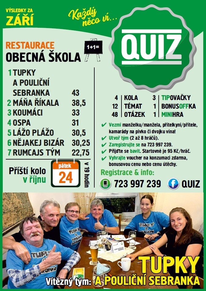 zve na další kolo QUIZU v pátek 24. 10. 2025 od 19:00 hodin.