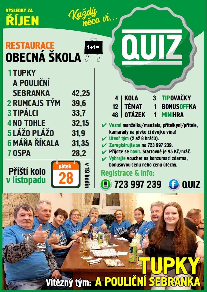 Pozvánka na další kolo QUIZU v pátek 28. 11. 2025. V neděli 30. 11. 2025 bude dopoledne ZAVŘENO. OTEVŘENO bude po rozsvícení vánočního stromu v 17:30 h.